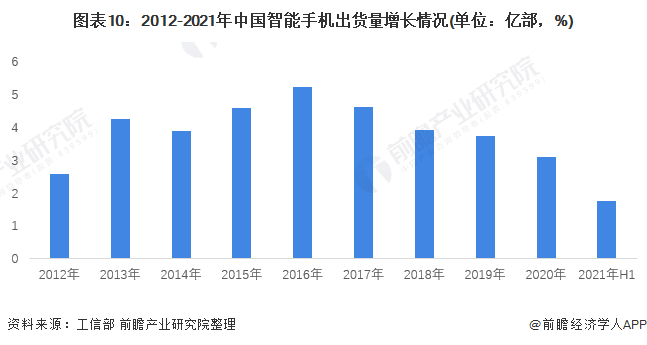 根据工信部的数据显示,2012-2020年,国内智能手机出货量呈波动趋势,2019年国内智能手机出货量3.72亿部,同比下降4.7%,占同期手机出货量的95.6%。2020年,国内智能手机出货量3.08亿部,同比下降20.8%。2021年上半年,智能手机累计出货量1.74亿部,同比增长13.7%。