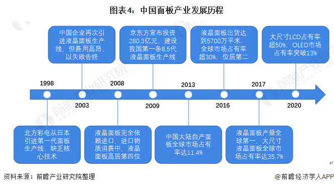 1998年9月,北方彩晶从日本DTI引进了一条第1代液晶面板生产线,由于没有核心技术,企业无法持续发展。2003年2月,京东方以3.8亿美元的价格收购了韩国现代电子的液晶业务,结束了中国自主生产液晶显示屏零时代,但是由于专利费用导致产品价格没有竞争力,这次尝试也以失败告终。至2008年,中国液晶面板仍完全依赖进口,甚至中国每年的进口物资消费排行中,液晶面板仅次于石油、铁矿石、芯片,而位居第四位。经过近年的发展,我国面板行业后来居上;2013年我国大陆自产面板全球市场占有率为11.4%,2016年出货面积约5700万平方米,全球出货量市场占有率超30%,居全球第二位。到2017年底,中国大尺寸液晶面板产能占据全球35.7%的份额,超越传统大尺寸液晶面板制造大国韩国,液晶面板产量已位居全球第一。2020年,中国大陆厂商在大尺寸LCD屏幕领域的市场份额总计已经超过了50%。同时,据BusinessKorea报道,中国厂商OLED面板在2020年的市场占有率突破13%,增速震惊韩国OLED业界。