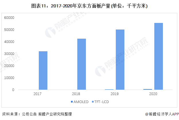 2017-2020年,国内主要面板企业京东方销量增加,而深天马销量有所下跌。2020年京东方TFT-LCD面板销量为55623千平方米,同比增长10.55%;AMOLED面板产量为501千平方米,同比增长86.25%。深天马2020年面板产量为30428.11万片,同比降低4.77%。