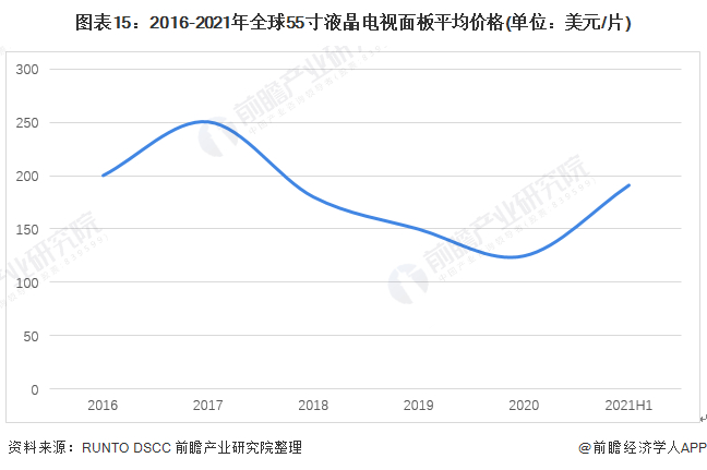 2018-2020年,随着中国多条高世代产线的投产,液晶面板产能激增,全球液晶面板供过于求,因此全球液晶面板价格出现持续下跌的趋势,部分商品价格降幅达到30%以上。2020年受疫情影响,面板原材料供应不足,导致面板价格有所上升。以55寸液晶电视面板为例,2017年平均价格达到最高值,为250美元/片,2019年下降到150美元/片。根据DSCC面板价格月度数据,2020年55寸面板平均价格125美元/片,2021年上半年激增至191美元/片。