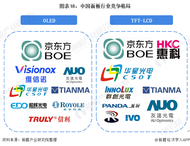从OLED与TFT-LCD两种细分市场来看,OLED市场的核心参与者主要有京东方、维信诺、华星光电、深天马、和辉光电、友达、信利、柔宇等厂商。其中京东方、维信诺、华星光电由于资金实力雄厚在中国OLED市场较为突出。TFT-LCD市场有京东方、惠科、华星光电、群创、友达、天马中电熊猫、中电彩虹、龙腾光电等企业。其中京东方、华星光电、群创、友达因为具有产能优势而领衔中国TFT-LCD市场。