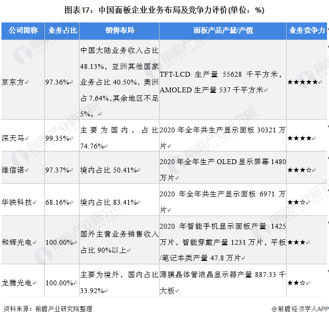 从企业业务竞争力来看,目前京东方、深天马在面板行业的竞争力较大,二者面板相关业务占比均超过98%。维信诺、华映科技等厂商面板业务营业收入紧随其后。和辉光电与龙腾光电面板产量较低,二者竞争力较弱。