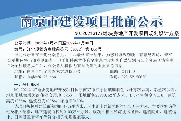 项目位于南京市江宁区麒麟科创园丹青路以南、泰盈路以西。规划用地性质为商住混合用地(Rb),用地面积27850.52平方米。1.0<容积率≤1.6,建筑高度≤35m,建筑密度<28%,绿地率>30%。