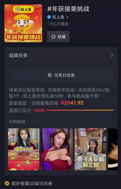 临近春节,粒上皇在传扬优秀传统文化的道路上,又有了有趣新玩法,发起了#年获接栗挑战#,邀请大家分享过去一年的收获,话题引发千万消费者参与,传播次数高达2亿+。