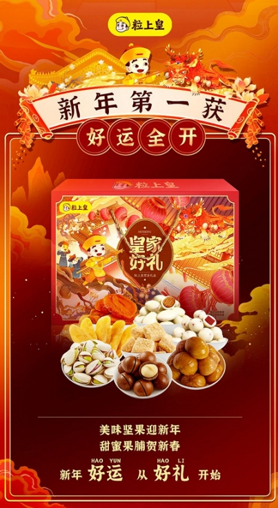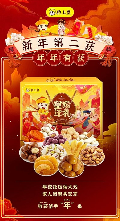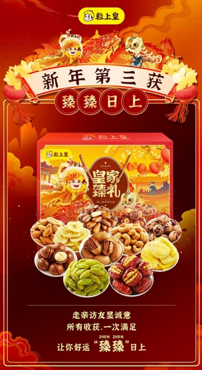 同时,粒上皇虽然起于板栗,却并不止步于板栗。粒上皇的产品团队甄选全球原生态的原料,传承古法技艺,打造出了囊括板栗类、炒货类、坚果类、蜜饯果干及现烤类的五大产品品类。在粒上皇打造的零食帝国中,不仅是享誉已久的板栗是颗颗精选,其他品类的产品也是粒粒上品,比如挑选“中国向日葵之乡”赤峰的葵瓜子,颗粒饱满、果味纯正的开心果……在此次推出的三款限定年货礼盒中,就囊括了这些品类的代表零食,比如开心果、碧根果、雪花半梅等,让年味的美好在味蕾绽放。