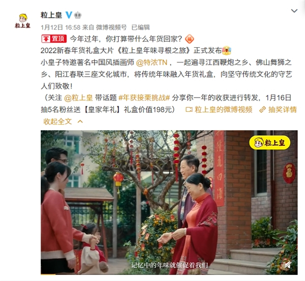 不过,想要攻克用户的心智,让用户对品牌产生更坚实的好感度,还需要更深层次的文化内容传播。粒上皇在发起#年货接栗挑战#期间,不仅用“新年好运接栗,和我一起接栗,收获新年好运”这样朗朗上口的宣传语进行活动宣传,让大家参与的意愿更高,收获更多UGC内容。在挑战正酣时,粒上皇还趁着热度在微信视频号、微博、小红书、腾讯、B站、西瓜影音等多个平台上线2022新春年货礼盒大片《粒上皇年味寻根之旅》,将整个活动推到新的高潮。