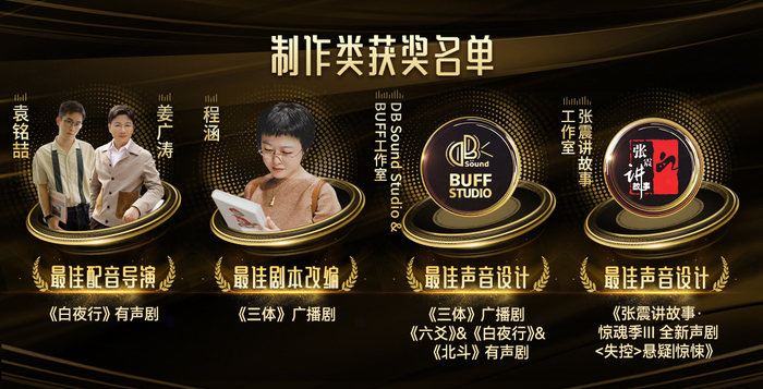 在制作类奖项中,《白夜行》有声剧的导演姜广涛、袁铭喆获得“最佳配音导演”奖,《三体》广播剧编剧程涵获得“最佳有声剧本改编”奖,“最佳声音设计”奖则被授予张震讲故事工作室、DB Sound Studio和BUFF工作室,他们曾为《张震讲故事•惊魂季Ⅲ》《三体》广播剧、《六爻》《白夜行》《北斗》等有声剧设计声音,以上奖项均由专家评审团评审决出。