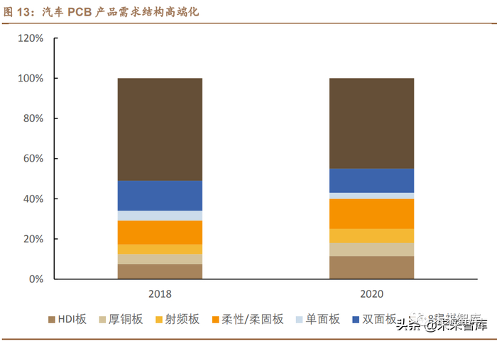 车载娱乐、新能源车、毫米波雷达将拉动 HDI、厚铜板及 FPC、高频板占比 提升。2018年,HDI板、厚铜板、射频板、柔性/刚柔板占比分别为7.5%、4.9%、 4.8%、12%。2020 年占比已分别提升至 11.5%、6.5%、7.0%、15%,合计占比 已从 29.2%快速提升至 40%。未来,随着信息和数据传输速度的增加,HDI 和柔 性/刚柔结合产品有望在车载娱乐系统中进一步渗透;毫米波雷达采用高频材料, 对高频 PCB 的需求将继续提升;新能源汽车对高电流、高电压的需求提升,厚 铜板产品以及 FPC 产品需求将随新能源车的渗透而提升。