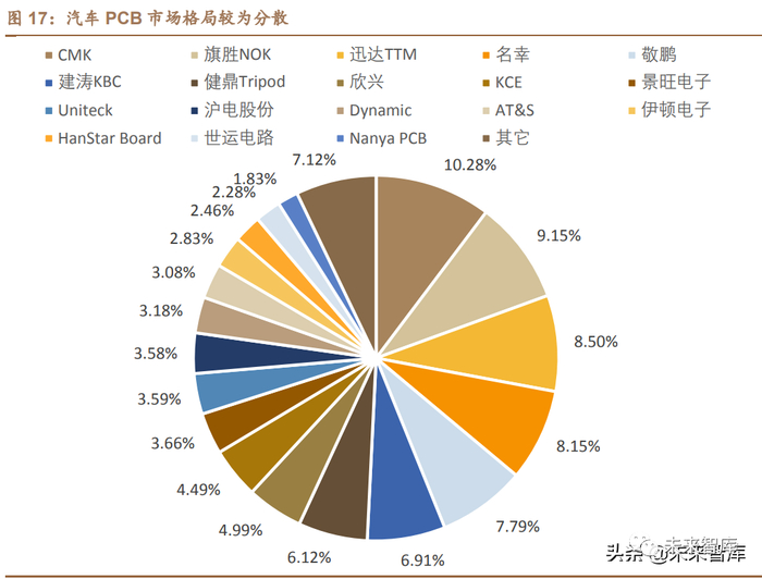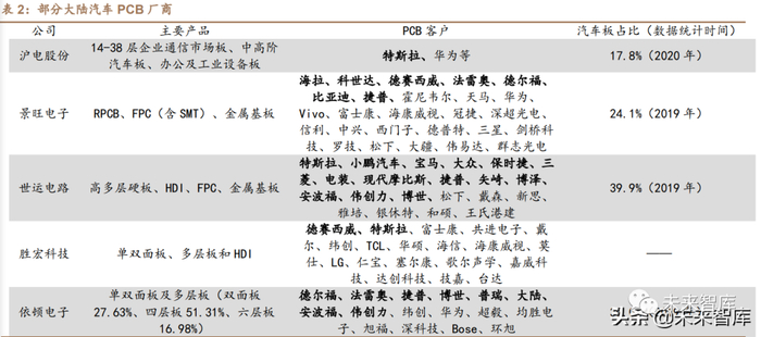 大陆企业布局领先,已进入大客户供应链。经过长期的积累,目前我国汽车 PCB已经形成了较强的竞争力,部分厂商已经得到世界一流整车客户的认可,普 遍都进入全球著名汽车零部件供应商的供应链。(报告来源:未来智库)