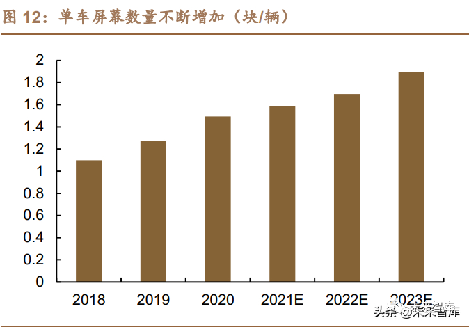 智能座舱:电子系统是人车交互的关键,车载屏幕大屏化、集成化、智能化 增加 PCB 需求。伴随着互联网技术和汽车技术融合的加深,汽车显示屏将带给 驾乘人员更多、更便捷的功能和体验。抬头显示、3D 触摸、人机交互越来越多 的新技术集成在显示屏上,让用户驾驶及娱乐体验更佳。技术及市场需求将刺激 汽车显示屏市场的大发展。根据 IHS 的测算,2020 年中控显示器市场中,9 英寸 及更大的显示器占比为 31%,预计 2026 年将提升至 43%。同时,随着后座屏幕 等兴起,单车屏幕数量预计将从 2020年的 1.5块/辆上升至 2023年的 1.9块/辆。屏幕中的背光模组需要使用大量 PCB,推动汽车 PCB 市场进一步上行。