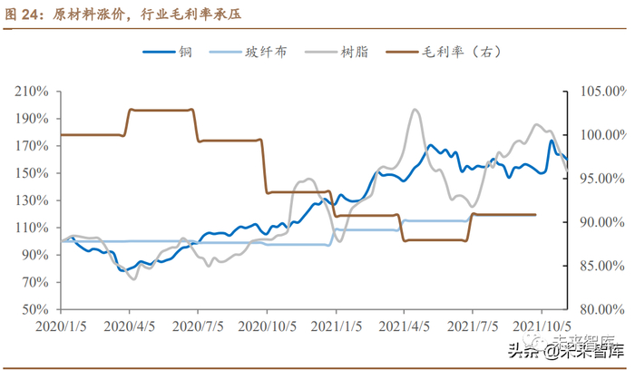 20Q2 以来,上游原材料掀起涨价潮,目前涨势已进入尾声。20Q2 以来, 材料占比最大的覆铜板价格涨势不断,且涨幅较大。进入 21Q3 之后,随着上游 大宗商品价格的逐步企稳,涨价厂商数量及涨价幅度有所放缓,涨价节奏明显放 缓。