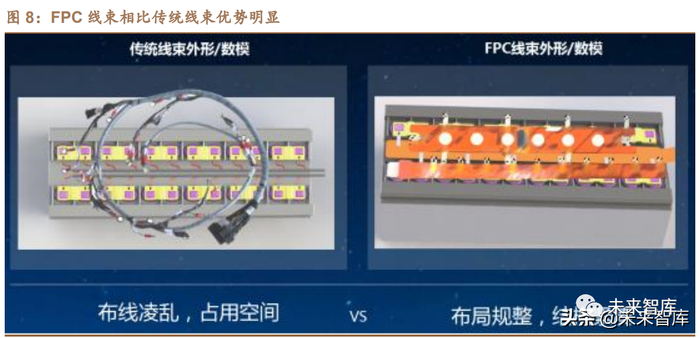 动力电池用 FPC:FPC 替代铜线线束趋势明确,提升 PCB 单车价值约 600 元。采集线是新能源汽车 BMS 系统所需配备的重要部件,实现监控新能源动力 电池电芯的电压和温度;连接数据采集和传输并自带过流保护功能;保护汽车动 力电池电芯,异常短路自动断开等功能。此前新能源汽车动力电池采集线采用传 统铜线方案,空间挤占大,Pack 装配环节自动化程度低。相较铜线线束,FPC 由于其高度集成、超薄厚度、超柔软度等优点,在安全性、轻量化、布局规整等 方面具备突出优势。