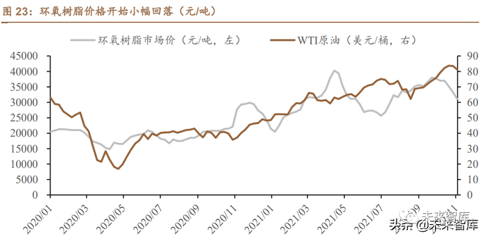 环氧树脂:价格呈现出波动式上涨,预计高位波动。原油价格暴涨,叠加通 货膨胀等多重因素,上游原材料价格上涨。叠加下游风电、涂料行业需求进入旺 季,环氧树脂价格上涨迅猛。21 年春节后美国寒潮导致环氧树脂大幅减产,进 一步加大了环氧树脂市场供需缺口。尽管环氧树脂价格出现小幅回落,受 2021Q4“双控双限”影响,供给端产能提升有限,预计价格趋势有望在 2021Q4 高位企稳,区间波动。