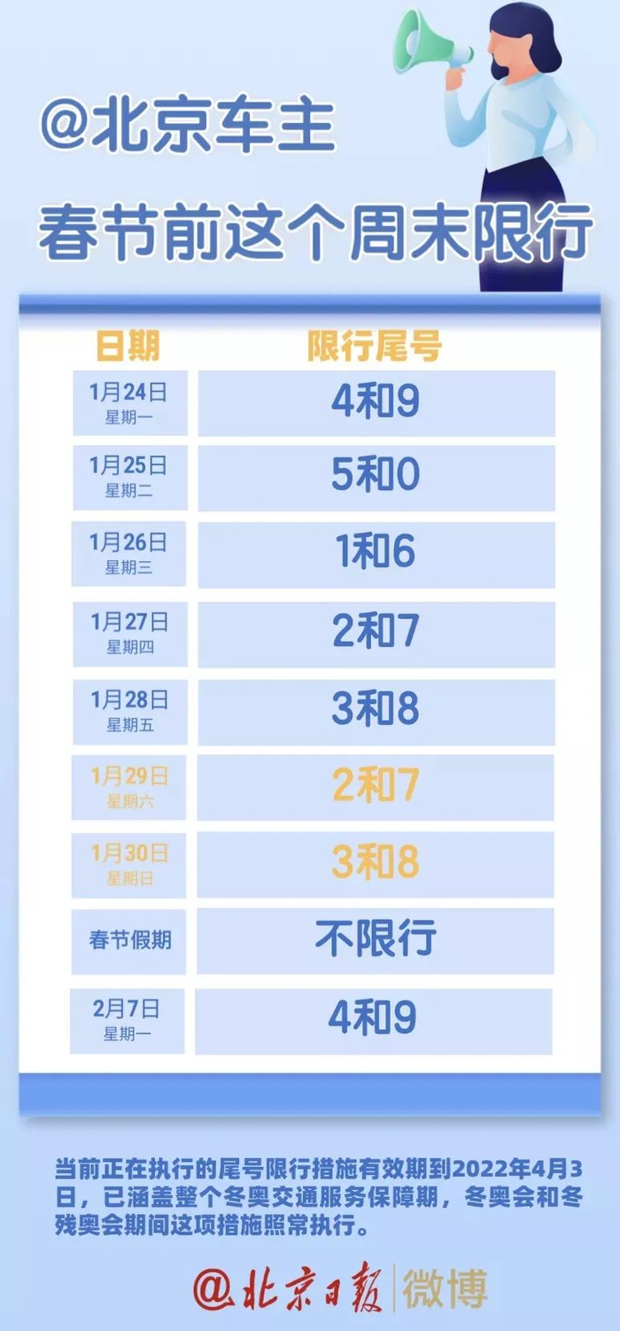 春节前调休工作日执行尾号限行政策:当前正在执行的尾号限行措施有效期到2022年4月3日,已涵盖整个冬奥交通服务保障期,冬奥会和冬残奥会期间这项措施照常执行。