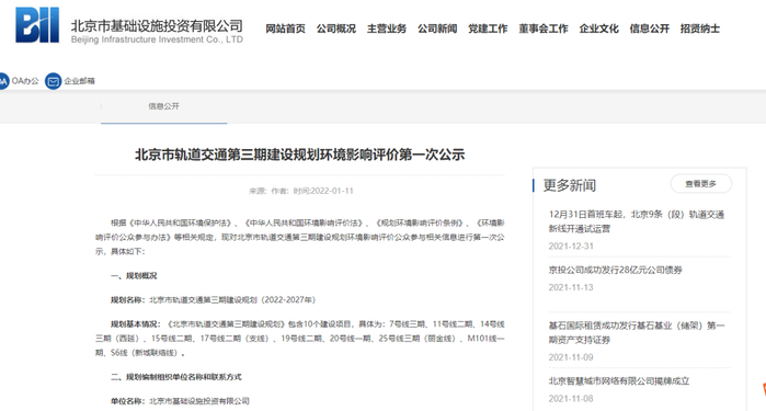 北京轨道交通第三期规划环评第一次公布:2021年12月9日,北京市规自委公布了《北京市轨道交通线网规划(2020年-2035年)》,将未来15年的地铁线路全部公开。2022年1月11日,北京市基础设施投资有限公司官网发布了《北京市轨道交通第三期建设规划环境影响评价第一次公示》。