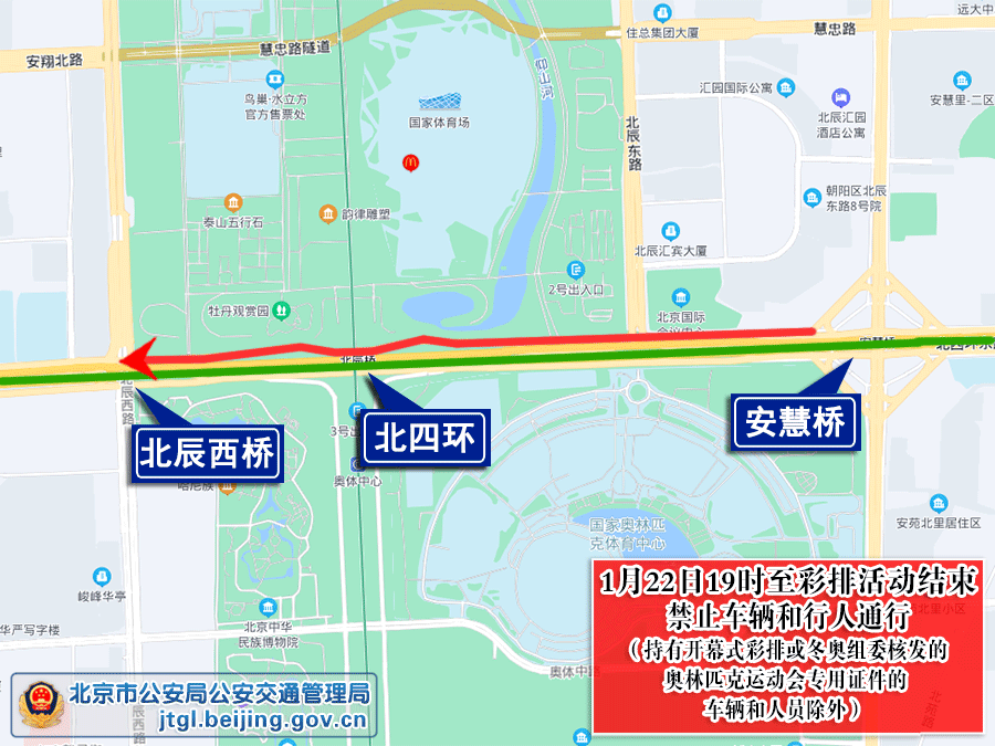 四、19时至彩排活动结束,北四环北侧辅路(安慧桥至北辰西桥),除持有开幕式彩排或冬奥组委核发的奥林匹克运动会专用证件的车辆和人员外,禁止其他车辆和行人通行。社会车辆和公交车可绕行北四环路主路等道路。