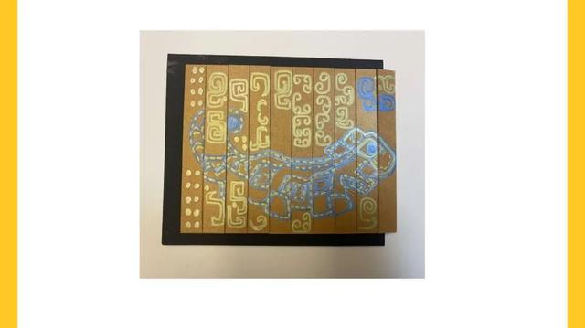 将画好玉虎的卡纸定位在相框底板上,距相框左侧边缘0.5cm;依次整齐排列裁开的画面,用美纹胶带将两端一条一条地与相框进行粘合。