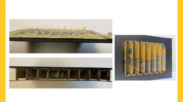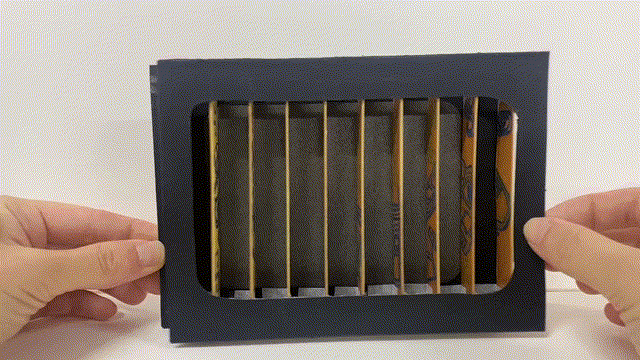 为了可以正反面取景,将选定的两张彩色卡纸裁成与画框同等大小,并将这两张卡纸粘合在一起。在彩色卡纸上标记1.5cm宽度的间隔符号(为了视觉效果,间隔宽度不宜太窄),为之后裁剪做准备。