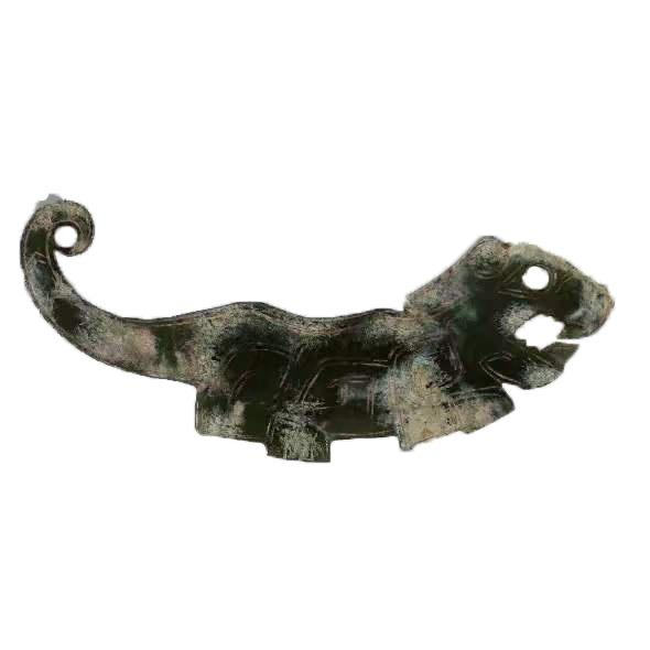 以虎为题材的玉器始见于新石器时代,流行于商周春秋。商代玉虎多为配饰,造型有圆雕和扁体两种,尾端钻有可以系挂的小圆孔。彼时的佩玉以动物造型最为常见,形制特征比较明显,多为片面雕,善于抓住对象瞬间的动感,神态毕现。