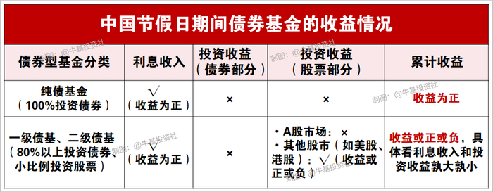 如果是既投资股票、又投资债券的债券基金,那么假期期间的累计收益就得视情况而论了,正收益或者负收益都有可能,具体看利息收入和投资收益孰大孰小。