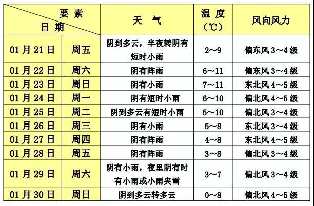 1月21日夜里至1月29日,嘉定将出现连续阴雨天气,较明显降水时段出现在22-23日和26-28日,雨量以中雨为主。