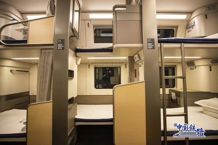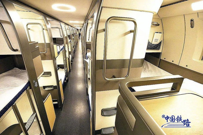 包厢设计比照航空商务舱,脚下与旁边铺位头部空间共享,可大幅提高空间利用效率。这就是为什么会出现“凹”铺位和“凸”铺位的原因。