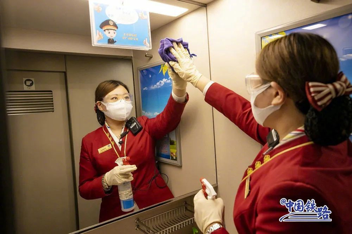 为做好春运保障工作,中国铁路北京局集团有限公司北京客运段根据不同阶段客流特征,强化疫情防控工作。列车运行途中,乘务员定时对车厢各部位进行全面消毒,确保旅客出行安全。
