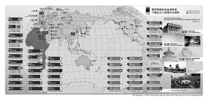 从这张图上,可以清晰地看到近130年发展历程的现代奥林匹克运动版图上,有三座城市具有非同一般的意义。第一座城市是希腊雅典,它是古代奥林匹克文化发源地,现代奥林匹克运动精神的源头和奥林匹克圣火的采集地,也是现代奥运会的起点——1896年4月6日第一届奥运会的举办地。第二座城市是法国巴黎,它是1892年11月25日《奥林匹克宣言》的诞生地——现代奥林匹克运动的起点和《奥林匹克宪章》的起草地等规则体系策划源头,也是1894年6月23日国际奥委会创始地。第三座城市是中国北京,它是世界第一座“双奥之城”,有机地把夏奥会和冬奥会两个平行的奥运会结合起来。