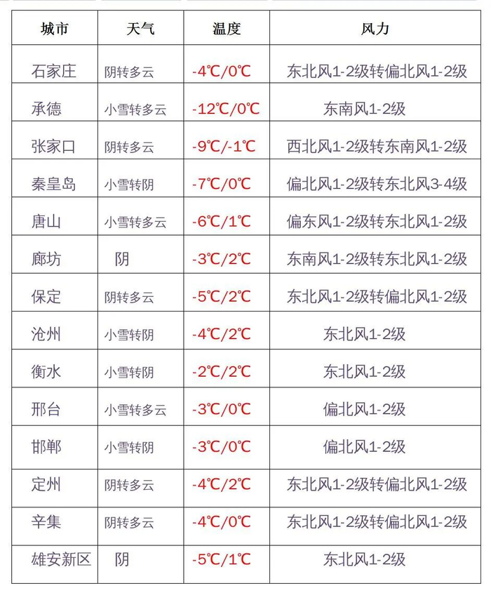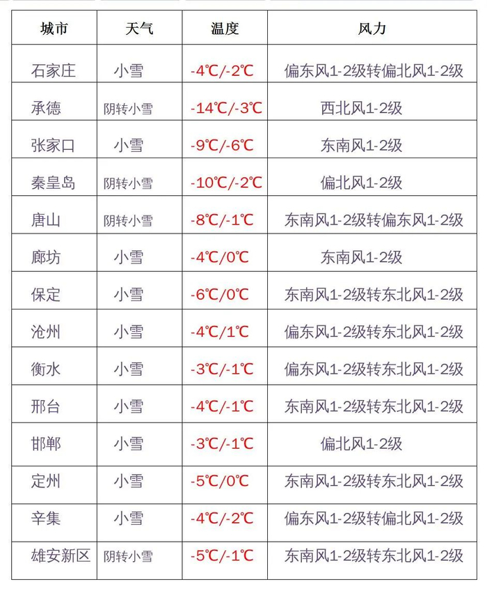 明天白天,坝上地区、承德东部、唐山、秦皇岛、廊坊南部、石家庄东部、沧州、衡水、邢台、邯郸阴有小雪转多云,其他地区阴转多云。