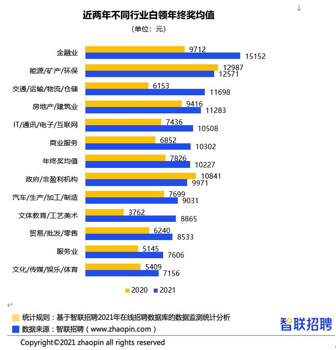 调研数据显示,2021年全国白领年终奖平均值为10227元,较2020年的7826元同比增长30.7%。