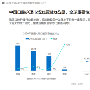 随着我国的经济发展和口腔健康知识的普及,群众的口腔意识逐渐提高。据有关资料显示,2020年我国口腔市场规模达到了71.01亿美元。虽然目前相较美、日、韩等发达国家,我国的人均口腔消费支出较低,但我国口腔市场显示出逐年上升的巨大增长潜力,2020年增速达13%。根据公开数据预测,未来15年中国口腔大健康市场将有望超过5000亿元。