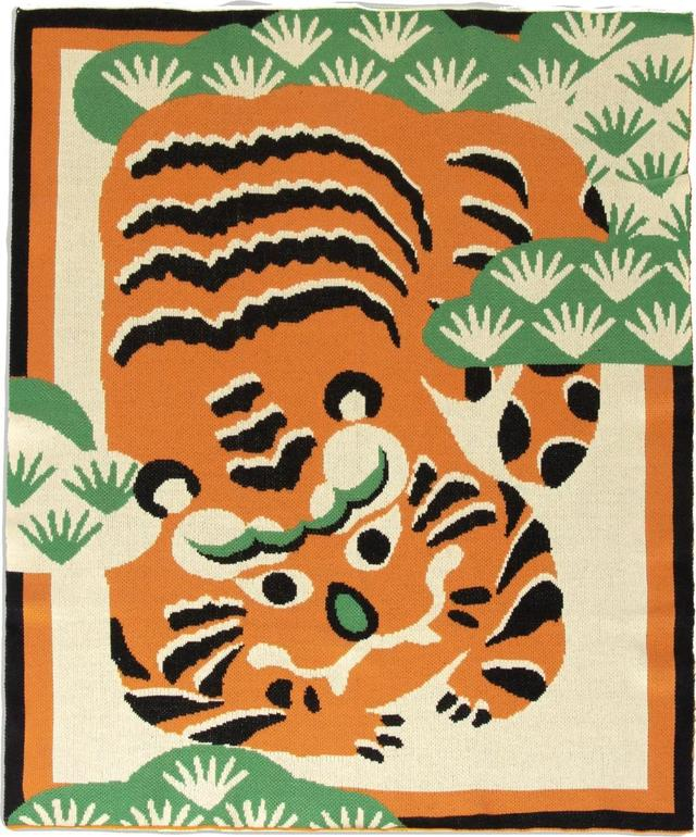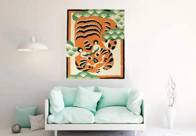 整体图案采用仿版画的效果,多用稚拙的几何造型,试图传达磁州窑的野逸画风和虎纹中的民俗趣味。居家毯使用四色勾花,贴合虎纹瓷枕生动的色彩表现。针数细密,使用双面提花芝麻点织法,还原设计师真实笔触。