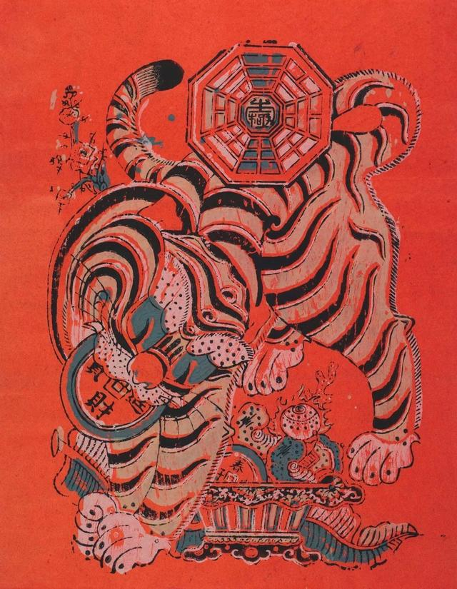 虎为百兽之王,千百年来极受民间百姓喜爱,既是驱邪避灾的镇宅神兽,也是象征财富的金钱虎,具有镇宅、生财等民俗文化内涵。此幅年画中的老虎略显威严,嘴中衔有寓意招财进宝的铜钱,身下有蕉叶及聚宝盆中的珊瑚、如意、春子招财铜钱等各类财宝,虎背上还印有和气生财的八卦图,以上吉祥图案皆反映着百姓求财求富、驱邪避灾的心理追求。画面整体造型简洁概括,粗中见细,用色对比强烈,具有鲜明的民间艺术特色。