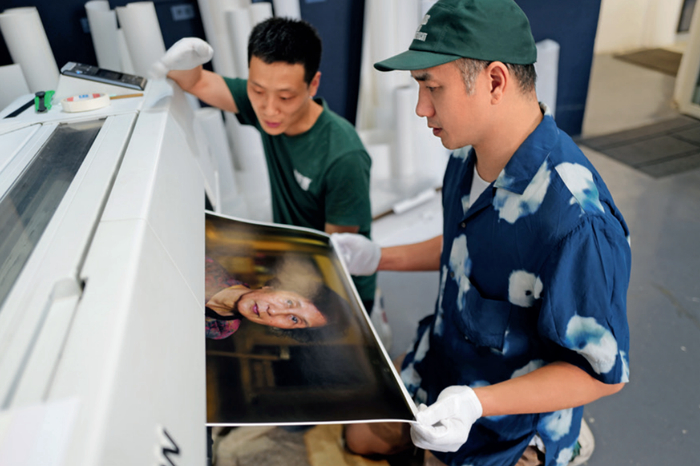·黄觉(右)正在打印照片,照片里的人物是他母亲。