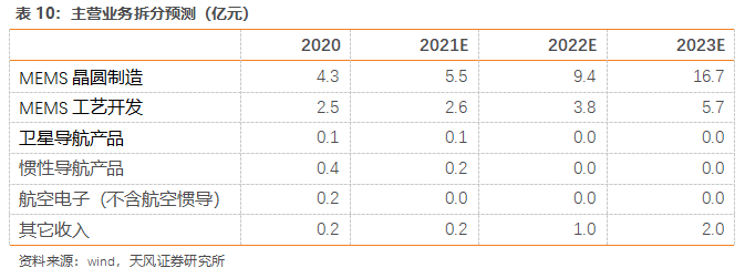 公司主要业务包括MEMS器件及其工艺开发服务。受益于通讯、生物医疗、工业汽车、消费电子等领域的MEMS芯片工艺开发及晶圆制造需求不断增长,公司子公司瑞典Silex作为全球领先的纯MEMS代工企业,产能持续扩产,子公司赛莱克斯北京也已建成规模化MEMS代工能力并正式投产。未来,随着公司MEMS业务产能爬坡,公司相关业务营收将进一步增长。同时,随着公司对于剩余部分导航业务的剥离,公司相关业务营收将减少。我们预计公司2021~2023年营收分别为8.53、14.16、24.31亿元,归母净利润分别为1.54、3.85、6.62亿元。
