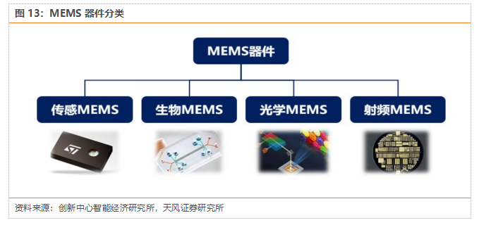 MEMS具有多种优势,可被用于制造多种器件。MEMS器件体积小,一般单个MEMS传感器的尺寸以毫米甚至微米为计量单位,同时,微型化以后的机械部件具有惯性小、谐振频率高、响应时间短等优点。MEMS器件采用硅基加工工艺,可兼容传统IC生产工艺。由于MEMS具有多种优势,MEMS被用于制造多种器件。根据技术原理,MEMS器件可分为传感MEMS、生物MEMS、光学MEMS和射频MEMS。