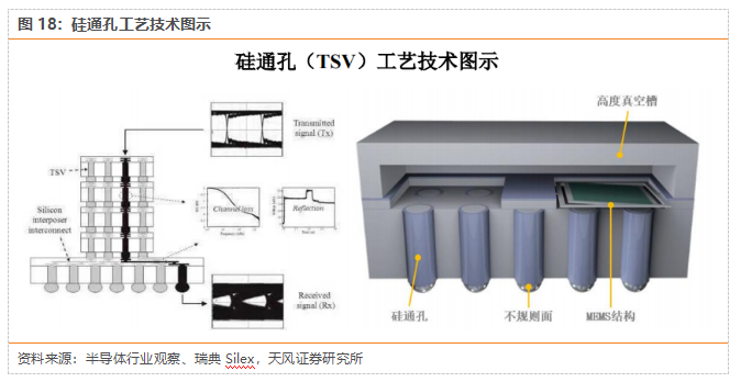 硅通孔技术是公司熟练掌握的MEMS制造技术之一。由于MEMS应用场景及产品种类的多样性,对MEMS制造工艺的需求也体现出高度的定制化与复杂性。在MEMS制造工艺中,公司熟练掌握硅通孔(TSV)和玻璃通孔(TGV)工艺技术。其中,硅通孔技术是一项高密度封装技术,正在逐渐取代目前工艺比较成熟的引线键合技术,被认为是第四代封装技术。硅通孔技术可以通过垂直互连减小互联长度、减小信号延迟、降低电容/电感,实现芯片间的低功耗、高速通讯、增加宽带和实现器件集成的小型化。