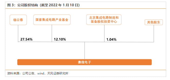 公司股权结构稳定,国家大基金助力公司成长。公司控股股东为杨云春,截至2022年1月10日,杨云春直接持有公司27.54%股份。同时,公司于2016年战略引入北京集成电路制造和装备股权投资中心。根据Wind数据,北京集成电路制造和装备股权投资中心在公司的持股比例为1.04%。此外,公司还于2019年引入战略股东国家集成电路产业投资基金股份有限公司。截至2022年1月10日,国家集成电路产业投资基金股份有限公司在公司的持股比例达到12.10%。