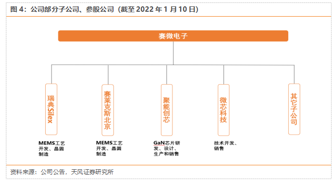 外延并购拓展业务,积极进行产业投资布局。公司围绕主要业务开展了一系列产业投资布局,直接或通过产业基金对产业链相关企业进行参股型投资。目前,公司主要子公司包括Silex Microsystems AB、SMI(Silex Microsystems Inc.)、SSA(Silex Securities AB)、运通电子有限公司、北京赛莱克斯国际科技有限公司、北京微芯科技有限公司以及赛莱克斯微系统科技(北京)有限公司等。同时,公司延续发展战略重大调整,资源聚焦半导体业务的需要,继续剥离剩余部分导航业务,出售耐威时代100%股权、对中测耐威进行减资。此外,公司根据发展需求,投资新设业务子公司,继续实施针对企业与基金的相关产业投资,如投资设立聚能国际、对爱集微进行增资、参投设立火眼基金等。
