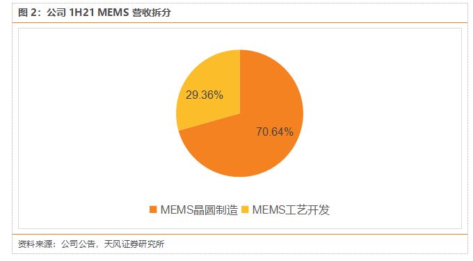 MEMS业务以晶圆制造为主,以工艺开发为辅。公司MEMS业务包括晶圆制造与工艺开发两类。其中,MEMS晶圆制造业务是指在完成MEMS芯片的工艺开发、实现产品设计固化、生产流程固化后,为客户提供批量晶圆制造服务;而MEMS工艺开发业务则根据客户提供的芯片设计方案,以满足产品性能,实现产品“可生产性”以及平衡经济效益为目标,利用工艺技术储备及项目开发经验,进行产品制造工艺流程的开发,为客户提供定制的产品制造流程。目前,公司MEMS业务以晶圆制造为主,1H21,公司MEMS晶圆制造营收达到2.55亿元,占MEMS业务总营收的71%。此外,公司MEMS工艺开发营收于1H21达到1.06亿元,占MEMS业务总营收的29%。