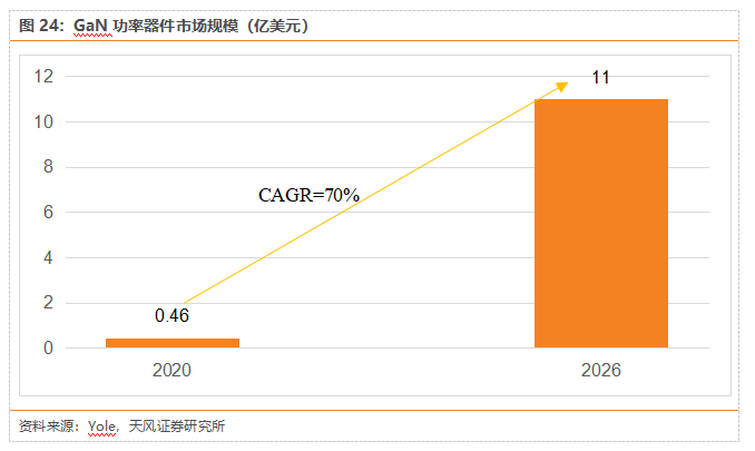 GaN市场成长空间广阔,市场规模有望随下游需求提升而迅速增长。随着5G时代的到来,5G基站与数据中心的建设将大幅带动GaN射频与功率器件市场,GaN在快充、LiDAR等方面的应用也将成为新需求增长点。根据Yole数据,2020年全球GaN功率器件市场规模为4600万美元,预计将于2026年增长至11亿美元,年复合增长率达到70%。