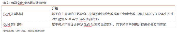 公司GaN业务包括外延材料与芯片设计两大环节。公司GaN业务主要可以分为GaN外延材料与GaN芯片设计。其中,GaN外延材料业务基于自主掌握的工艺诀窍、根据既定技术参数或客户指定参数,通过MOCVD设备生长并对外销售6~8英寸GaN外延材料;而GaN芯片设计业务则基于技术积累设计开发GaN功率及微波芯片,向下游客户销售并提供相关应用方案。