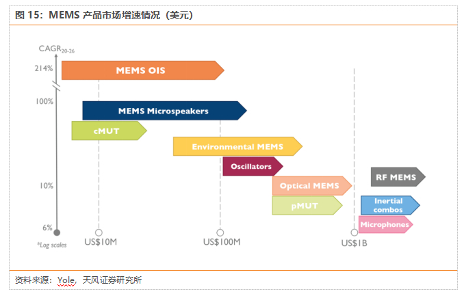 MEMS OIS、MEMS麦克风将成为市场增速最快的MEMS产品。移动终端是MEMS的重要增长点,除了传统的惯性传感器、MEMS麦克风、压力传感器的普及和组合化趋势外,气压传感器、摄像头光学防抖OIS陀螺仪渗透率也快速提升。预计2020~2026,MEMS OIS市场年复合增长率约达到214%,MEMS麦克风市场规模年复合增长率约100%。