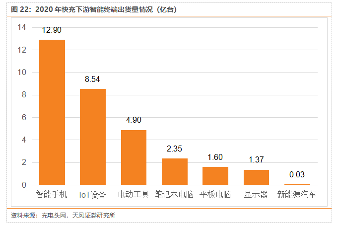 快充产品加速市场对于GaN的需求提升。GaN是目前全球最快的功率开关器件,并可以在高速开关的情况下仍保持高效率水平,能够应用于更小的元件,应用于充电器可有效缩小产品尺寸。GaN的高频高速使得大功率USB PD充电器可以以小巧的体积实现大功率输出,满足了传统功率开关无法满足的需求,所以其使用率也在不断提升。2020年,全球快充下游智能终端出货量超过31亿个。随着GaN在快充市场的使用率提升以及快充产品出货量的增长,GaN市场有望进一步扩大。