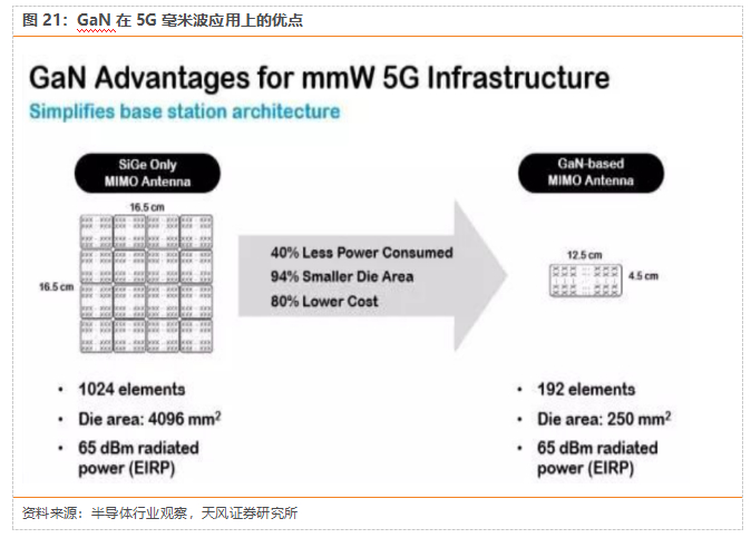 5G市场率先打开GaN商用空间。因为GaN材料及芯片具有高热导率、高击穿场强、高饱和电子速率等优点,所以在光电子、高温大功率器件和高频微波器件应用方面具有广阔的前景。5G对GaN的需求增长十分明显,5G基站所需的射频功率放大器为GaN带来了绝佳的市场机遇。在5G的关键技术Massive MIMO应用中,基站收发信机上使用大数量(如32/64等)的阵列天线来实现了更大的无线数据流量和连接可靠性,这种架构需要相应的射频收发单元阵列配套,所以射频器件的数量将大为增加,器件的尺寸大小很关键,利用GaN的尺寸小、效率高和功率密度大的特点可实现高集化的解决方案。同时,在5G毫米波应用上,GaN的高功率密度特性在实现相同覆盖条件及用户追踪功能下,可有效减少收发通道数及整体方案的尺寸,实现性能成本的最优化组合。随着5G的普及,GaN产品的应用数量也将不断上涨,推动GaN市场快速成长。