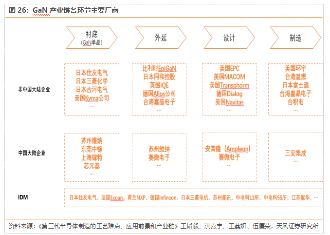 GaN产业链各环节多点竞争。GaN器件产业链各环节依次为:GaN单晶衬底(或SiC、蓝宝石、Si)到GaN材料外延到器件设计到器件制造。其中,GaN衬底主要由日本公司主导;GaN外延片相关企业主要有比利时的EpiGaN、英国的IQE、日本的NTT-AT、国内的赛微电子、苏州晶湛等;GaN器件设计厂商包括EPC、MACOM、Dialog等。目前,全球GaN器件产业以IDM为主,但随着材料技术不断成熟及市场需求增长,垂直分工模式也在逐渐兴起。