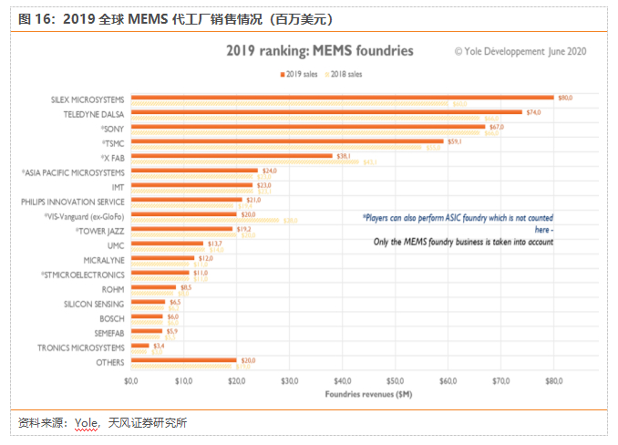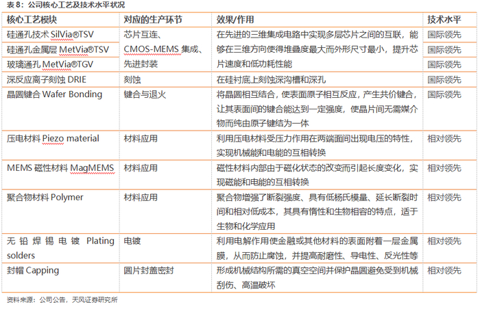 公司已成为全球排名第一的MEMS纯代工厂,制造技术业内领先。公司长期保持在全球MEMS纯晶圆代工第一梯队,2019及2020年排名第一,代表着业内主流技术水平。自2000年至今,公司参与了400余项MEMS工艺开发项目,代工生产了包括微镜、光开关、片上实验室、微热辐射计、硅麦克风等在内的多种MEMS产品。目前,公司拥有覆盖MEMS领域的全面工艺技术储备,关键技术已成熟并经过多年的生产检验,TSV、TGV、SilVia、MetVia、DRIE及晶圆键合等技术模块行业领先。