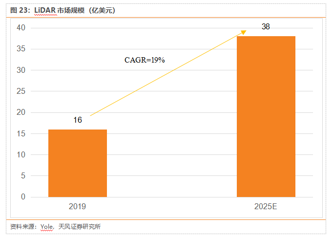 LiDAR应用增长,促进GaN市场规模扩大。除5G与快充市场外,GaN也被应用于LiDAR中。氮化镓场效应晶体管相较MOSFET器件而言,开关速度快十倍,使得LiDAR系统具备优越的解象度及更快速的反应时间,优良的性能也推动了LiDAR应用增长。根据Yole数据,2019~2025年预计全球LiDAR市场将从16亿美元增长为38亿美元,年复合增长率达到19%。随着LiDAR市场的扩大,GaN产品市场也将持续成长。