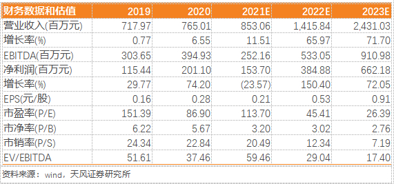 我们预计21-23年公司实现归母净利润1.54/3.85/6.62亿元,考虑到公司正处于产能释放的快速增长期,并参考可比公司22年PE均值,给予公司60倍PE,对应市值为231亿元,对应价格31.64元/股,首次覆盖给予买入评级。