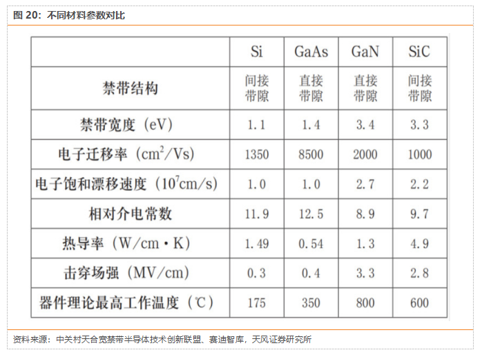 GaN材料特性具备耐高温、高频等特性,应用前景广阔。GaN作为第三代半导体具有宽带隙(3.4 eV)、击穿场强大(3.3 MW / cm)、电子饱和漂移速度高(2.7 * 107 cm / s)等物理结构优势。在以往的半导体材料中,Si是目前集成电路及半导体器件的主要材料,但其带隙窄,击穿电压低,在高频高功率器件的应用上效果不佳。以GaAs代表的第二代半导体材料由于电子迁移速率高,抗辐射等优点在微波通信领域有着重要的应用价值,是目前通信用半导体材料的基础。然而,GaAs的带隙和击穿电压仍难以满足高频高功率器件的要求。而GaN相较前两代半导体材料具有更大的禁带宽度和击穿电压,同时化学稳定性高,能够耐高温,耐腐蚀,因此在光电器件以及高频高功率电子器件应用上具有广阔的前景。